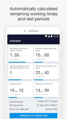 Rakendus muudab töö- ja puhkeaja jälgimise ja planeerimise erakordselt lihtsaks. Autosert Tacho arvutab automaatselt järelejäänud sõiduaega, jälgib ööpäevaseid ja nädalaseid puhkeaegu ning annab ülevaate võimalikest rikkumiste tendentsidest. Kõik olulised sündmused ja tähtajad on koondatud ühele selgele ekraanile, aidates sul jääda vastavusse EU tööaja direktiividega ning vältida trahve. Lisaks pakub arhiiv mugavat ligipääsu varasematele tegevustele ja allalaadimistele, hoides sind alati kursis oma kohustustega.