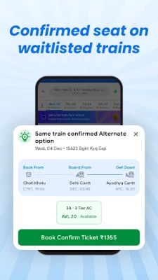 ixigo paistab silma oma ainulaadse 'Alternate Travel Plan' funktsiooniga, pakkudes kuni 3-kordset tagasimakset, kui teie pilet peaks jääma ootelistile – see hõlmab nii piletihinda kui ka kupongi edasisteks reisideks. Lisaks tagab 'Assured' teenus 100% tagasimakse kohese tühistamise korral, ilma lisatasudeta. Saate igal ajal kontrollida PNR staatust ja ootelistide ennustusi, samuti jälgida oma rongi reaalajas asukohta, mis töötab isegi internetiühenduseta. Kiire Tatkal-piletite broneerimine ja täpne teave vabade kohtade kohta on samuti teie käeulatuses.