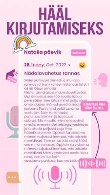Minu päevik muudab eneseväljenduse lihtsaks ja mitmekesiseks. Kirjutage oma mõtted ja tunded tekstina, lisage fotosid, et hetki elavamalt meenutada, või rääkige oma lugu otse rakendusse – nutikas hääle tekstiks teisendamise funktsioon muudab teie kõneldud sõnad automaatselt kirjutatud sisuks. Iga kanne on ainulaadne ja saate seda ka isikupärastada. Valige erinevate taustade, fontide ja tekstivärvide vahel, et teie märkmed peegeldaksid täpselt teie meeleolu. Emotikonide lisamine aitab anda edasi seda, mida sõnad alati ei suuda.