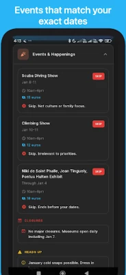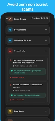 Erinevalt teistest planeerijatest, mis ütlevad, kuhu minna, hoiatab Navica teid ka selle eest, mida vältida. Meie süsteem annab põhjaliku ülevaate levinud turistipettustest, selgitades, kuidas need toimivad, kuidas neile reageerida ja milliseid tagajärgi neist hoidumata jätmine tuua võib. Samuti pakub see kohalikke ohutusteateid ja nutikaid varuplaane, et tagada teie meelerahu. Avastage autentseid elamusi tänu kohalikele soovitustele parimate linnaosade, toidukohtade ja kultuuritavade kohta, vältides tavapäraseid turistilõkse. Lisaks saate oma Navica koostatud reisiplaanid hõlpsasti jagada sõprade või perega, saates neile lihtsa lingi. Teie kaaslased saavad kava veebibrauseris vaadata ka ilma rakendust installimata, muutes grupireiside planeerimise ja kooskõlastamise eriti mugavaks.